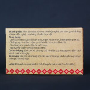 Xà phòng chứa dầu dừa hữu cơ, tinh bột nghệ, bột cám gạo kết hợp với tinh dầu nghệ, hoa hồng, thuần thực vật